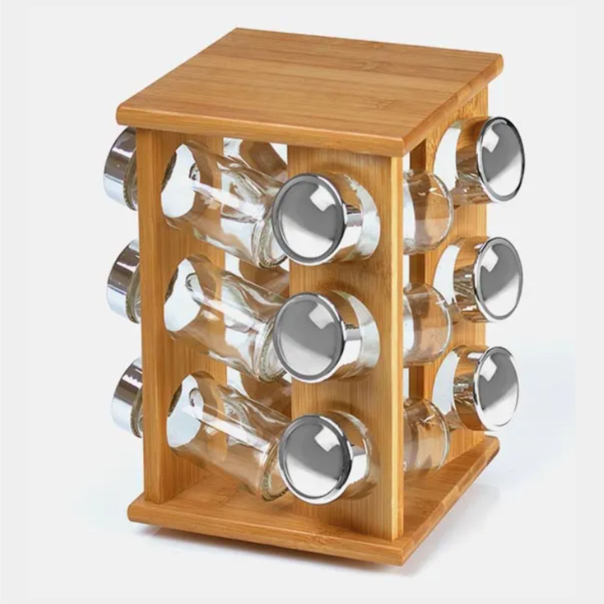 Porta Condimentos em Bambu/Vidro. Acompanha base giratória em Bambu e 12 porta condimentos em Vidro com tampa. Capacidade de cada porta condimento: 100ml
